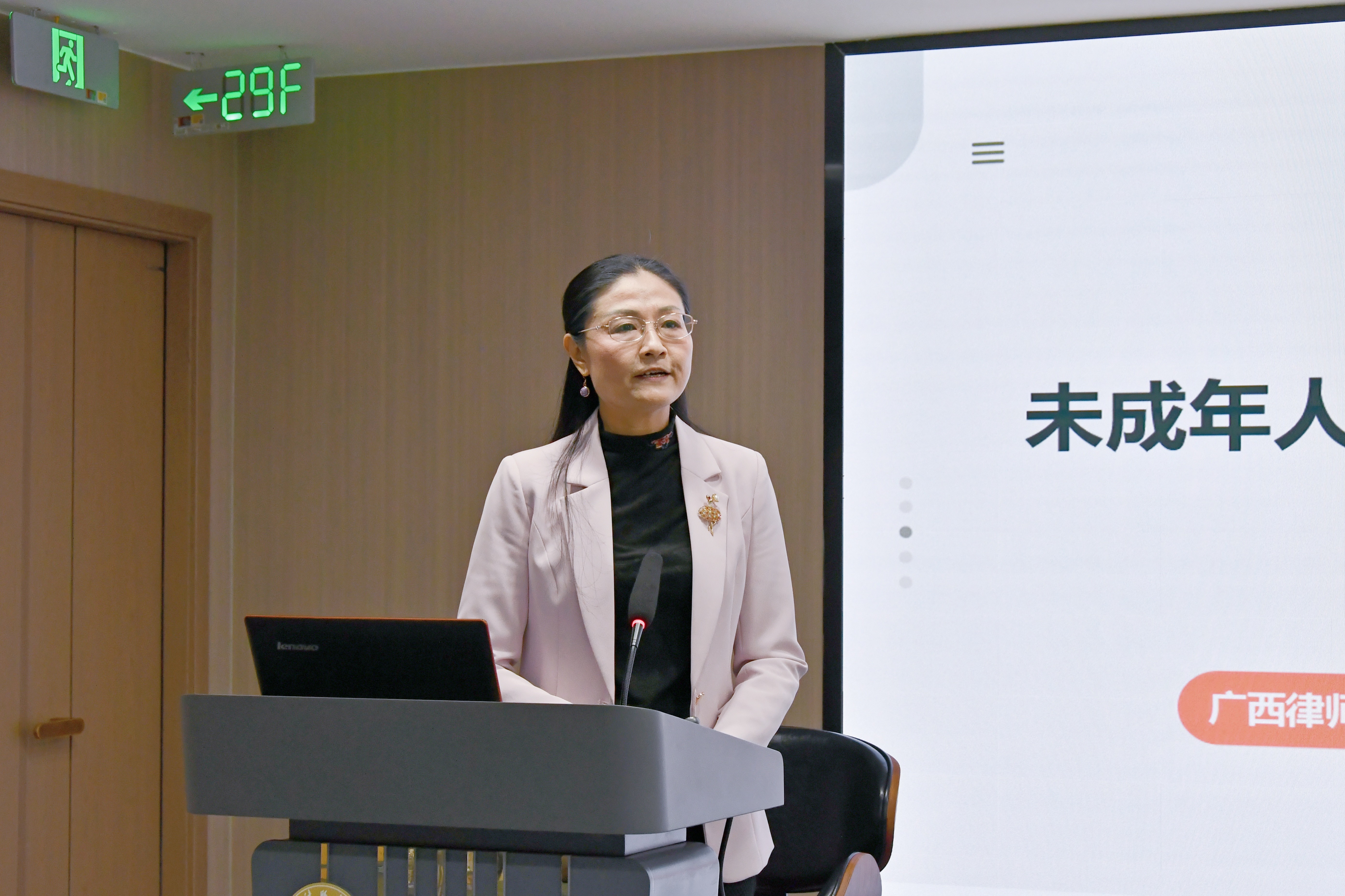 黃春芳律師以《未成年人刑事司法保護(hù)之律師路徑》為主題,從“健全律協(xié)未成年人保護(hù)機(jī)構(gòu)”、“律師為涉案未成年人的幫助和作用”、“強(qiáng)化律師服務(wù)在涉未成年人刑事案件中有效性的總體思路”、“廣西未保律師的活動(dòng)開(kāi)展情況”四個(gè)方面進(jìn)行分享,強(qiáng)調(diào)了健全律協(xié)未成年人保護(hù)機(jī)構(gòu)的重要性,提出了附條件不起訴、社會(huì)調(diào)查報(bào)告等新思路,建議建立涉未成年人案件法律援助律師庫(kù)、法律援助時(shí)間前移,倡議支持刑事附帶民事訴訟未成年人被害人精神撫慰金的主張等等,深入剖析了未成年人保護(hù)案件中的核心法律問(wèn)題與代理要點(diǎn),為與會(huì)者提供了極具針對(duì)性的業(yè)務(wù)指引。最后,她還介紹了廣西未保律師的活動(dòng)開(kāi)展情況,展示了當(dāng)?shù)芈蓭熢谖闯赡耆吮Wo(hù)領(lǐng)域的積極實(shí)踐與成果。