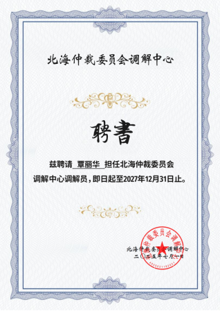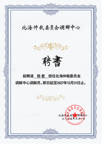 為響應(yīng)國(guó)家多元化糾紛解決機(jī)制建設(shè)號(hào)召,推動(dòng)社會(huì)矛盾高效化解,北海仲裁委員會(huì)調(diào)解中心正式打造調(diào)解一站式服務(wù)平臺(tái),面向法院、行業(yè)協(xié)會(huì)、高校等機(jī)構(gòu)進(jìn)行納新。2025年7月17日,先衡律所陳君律師、覃麗華律師收到聘書,即日起擔(dān)任北海仲裁委員會(huì)調(diào)解中心調(diào)解員,任期兩年。