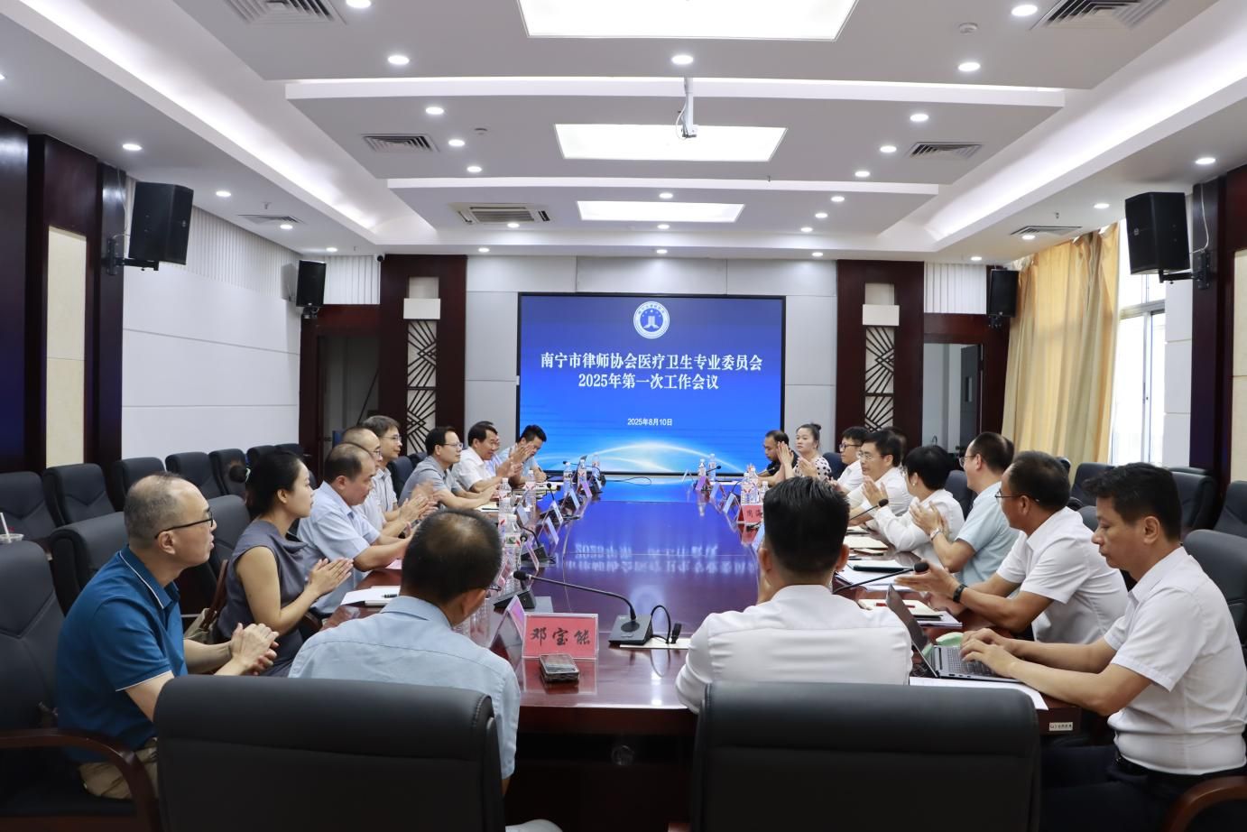 2025年8月10日下午,南寧市律師協(xié)會醫(yī)療衛(wèi)生專業(yè)委員會在南寧市司法局順利召開第一次全體委員會議(以下簡稱“醫(yī)專委”),會議聚焦年度工作計劃及四年規(guī)劃(2025-2029)、《醫(yī)療監(jiān)督管理辦法(征求意見稿)》專題研討、學習傳達專委會規(guī)則和委員履職考核辦法等議程有序開展。南寧市律師協(xié)會會長周海船、副會長韋琳、監(jiān)事覃有祺出席會議,醫(yī)專委全體委員參加會議。會議由醫(yī)療衛(wèi)生專業(yè)委員會主任謝青松主持。