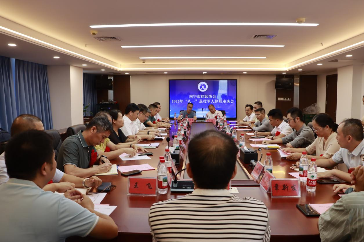 2025年8月1日,南寧市律師協(xié)會2025年“八一”退役軍人律師座談會在南寧市律師協(xié)會會議室召開。南寧市律師協(xié)會會長周海船應(yīng)邀出席,南寧市律師協(xié)會財務(wù)委員會副主任黃學(xué)明、南寧市退役軍人律師代表等23人參加座談。座談會由南寧市律師協(xié)會副會長藍(lán)斌主持。