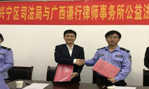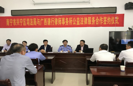 圖為廣西謙行律師事務(wù)所與南寧市興寧區(qū)公益法律服務(wù)合作協(xié)議簽訂現(xiàn)場