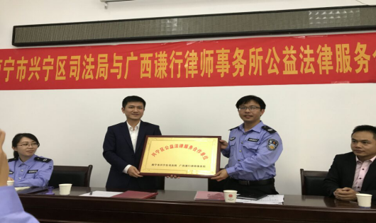活動中,黃萬榮與羅旭就相關(guān)合作事項簽訂了《公益法律服務(wù)合作協(xié)議》,并授予廣西謙行律師事務(wù)所 “興寧區(qū)公益法律服務(wù)合作單位”牌匾。