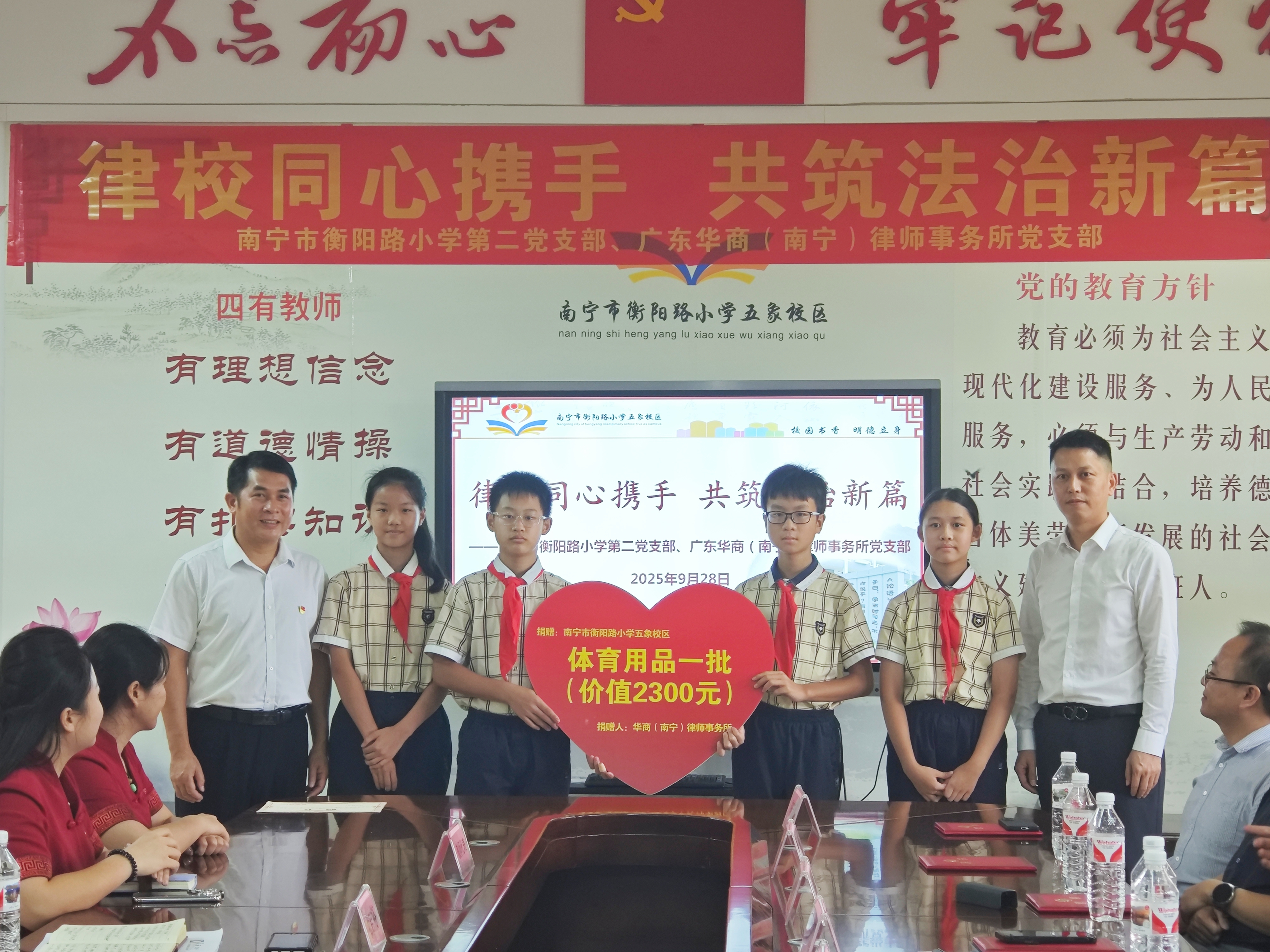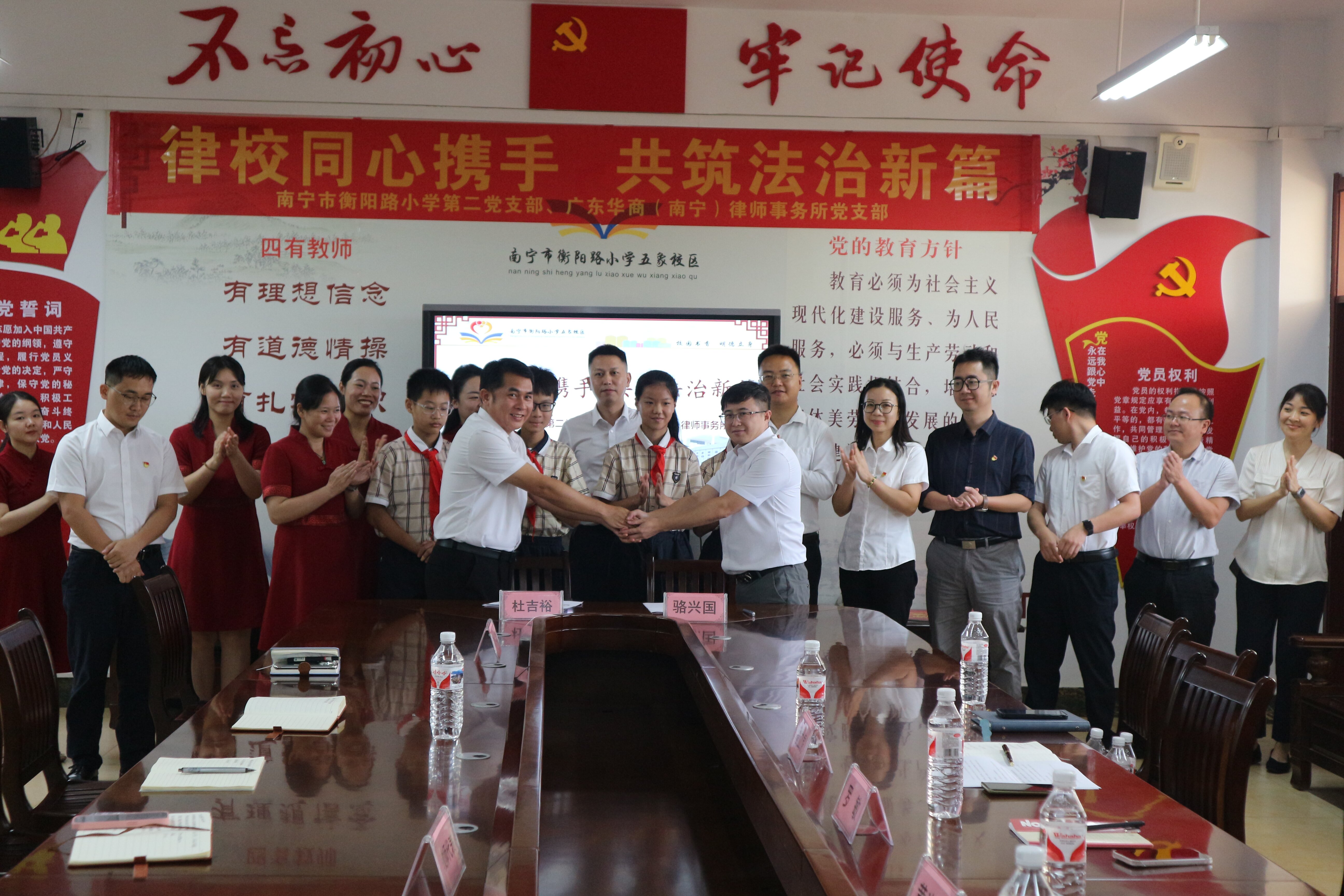 9月28日下午,華商(南寧)律師事務(wù)所創(chuàng)始合伙人、副主任駱興國律師,公益委、刑辯委主任潘立虎律師,公益委副主任羅敏律師,涉外委副主任林源律師以及公益委委員陳志勇律師、張志軒律師、梁艷律師等共同前往南寧市衡陽路小學(xué)五象校區(qū)展開簽約活動(dòng)。衡陽路小學(xué)副校長杜吉裕以及其他教師出席會(huì)議。