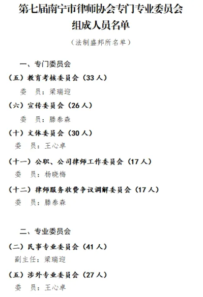 近日,第七屆南寧市律師協(xié)會專門、專業(yè)委員會組成人員名單正式印發(fā),我所梁瑞迎、王心卓、楊曉梅、滕泰森律師憑借專業(yè)素養(yǎng)與執(zhí)業(yè)能力成功入選!