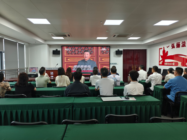 律師們提早來到會議室,等待觀看直播。上午9時,大會正式開始,習近平總書記出席并發(fā)表重要講話。當天安門廣場上閱兵式與分列式進行時,受閱部隊步伐鏗鏘、裝備陣列如山,新型國產(chǎn)主戰(zhàn)裝備及空中梯隊米秒不差地飛越,這一幕幕讓律師們深感震撼。