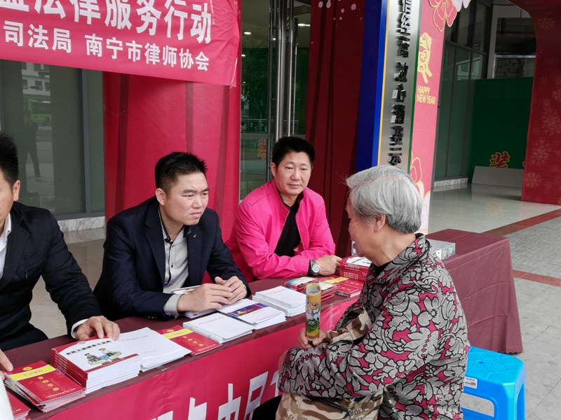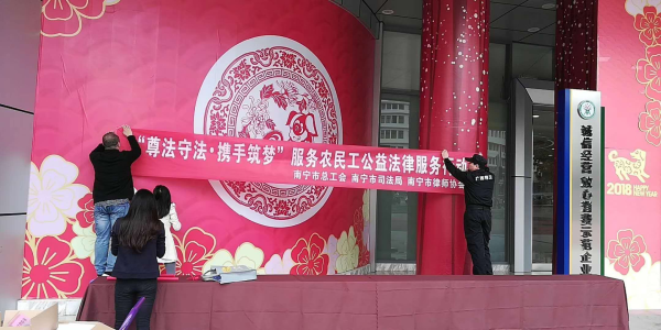 根據(jù)《南寧市總工會 南寧市司法局 南寧市律師協(xié)會“尊法守法?攜手筑夢”服務農(nóng)民工公益法律服務行動實施方案》要求,2018年2月28日下午,南寧市總工會、南寧市司法局和南寧市律師協(xié)會在南寧市百貨?MMGO聯(lián)合開展“尊法守法?攜手筑夢”服務農(nóng)民工公益法律服務行動。我所王小兵主任及鄧桂華、梁瑞迎副主任積極參與此次公益法律服務行動。